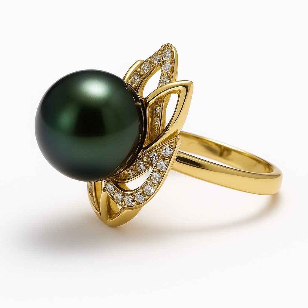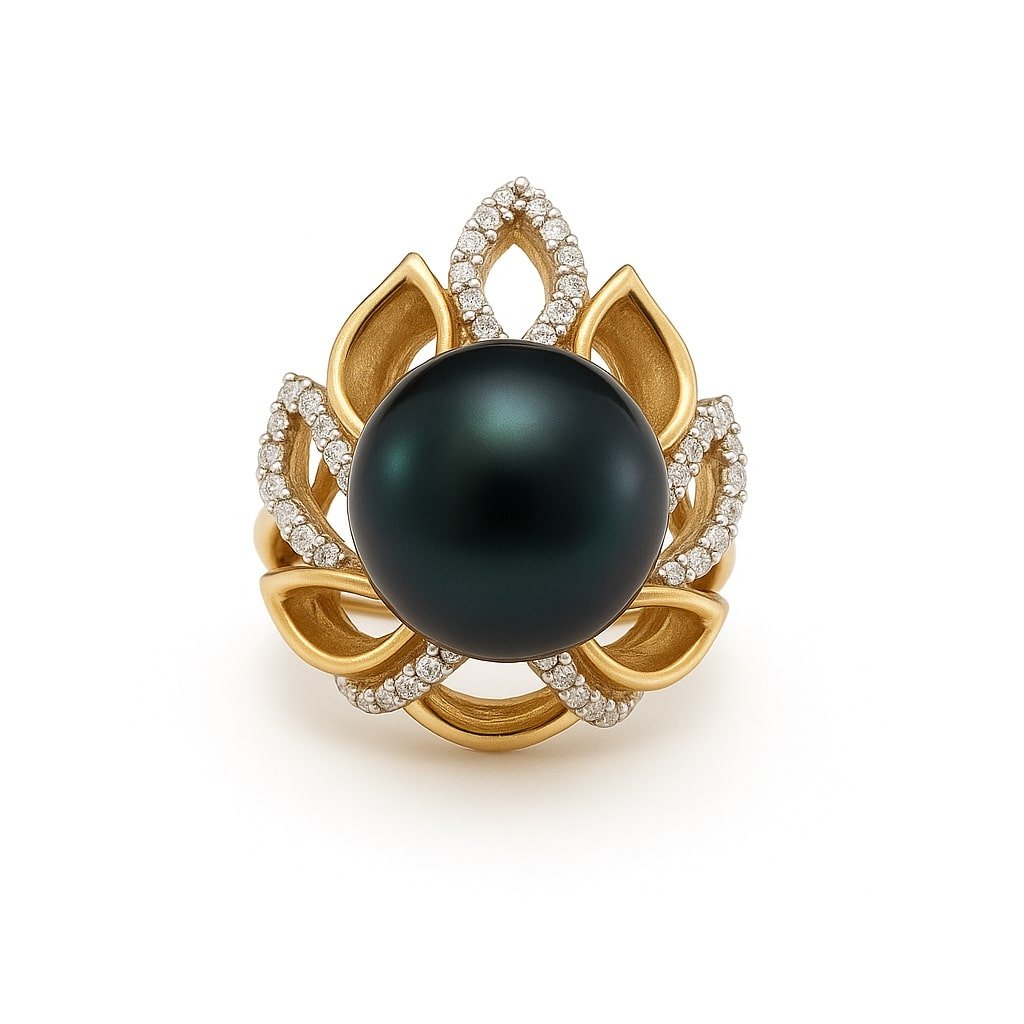 Tento prsten na první pohled zaujme svou velkolepostí a vzdušným designem. Dominantní tahitská perla o průměru 12 mm je zasazena do jemně tvarované zlaté obruby, která podtrhuje její přirozený zeleno-fialový lesk. 43 drobných briliantů po obvodu dodává prstenu decentní, ale nepřehlédnutelný třpyt.